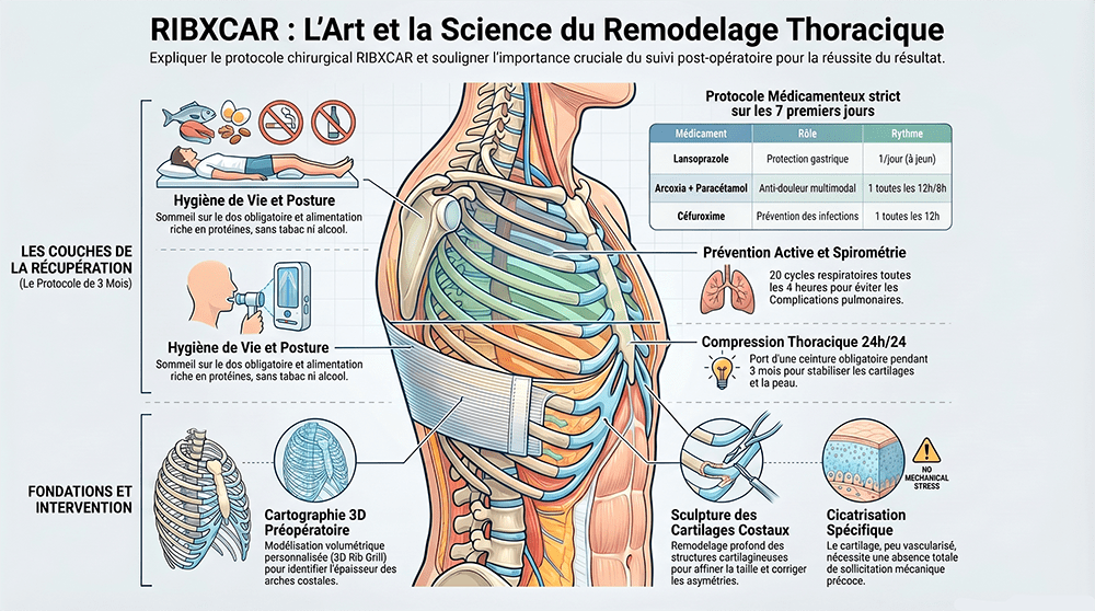 Ce qui distingue RIBXCAR d’autres approches de sculpture thoracique réside dans la combinaison de trois éléments : une planification numérique préopératoire rigoureuse, une gestuelle chirurgicale millimétrée, et un protocole post-opératoire structuré dont le respect conditionne directement la qualité et la durabilité du résultat.